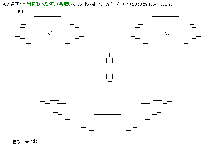 664 名前:本当にあった怖い名無し[sage] 投稿日:2009/11/11(水) 10:20:40 ID:6n//abQ80