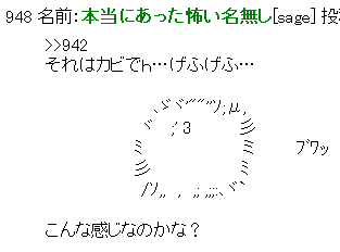 947 名前:本当にあった怖い名無し[sage] 投稿日:2009/12/22(火) 18:45:04 ID:XxM0UQy+0