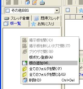 「その他BBS」を選択したら、板一覧の空白部分で右クリックします。出てきたメニューから「板の追加」を選択します。